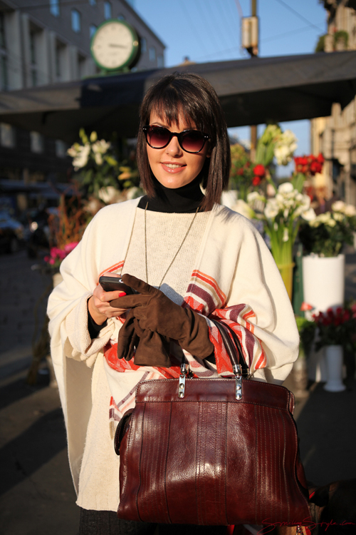 Also, just have a look at Mimi in the picture 🙂 The poncho looks great with the thick red walking cord, the cream jumper and the dark brown bag. And guess where the poncho came from…. H&M!! Combining black and brown is often not an easy task, but the high collar works great, particularly given her perfect haircut, and the finishing touch given by the Owl pendant. Hitting the city with your dog is a good time for comfy shoes, and imagine this outfit with black leather high heels, oh yes!