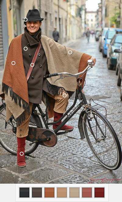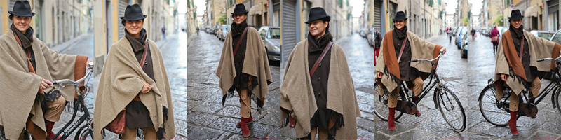 Patricia told me that she is originally from Mexico, and now working as a teacher in Florence. If I got her right she claimed her students don’t think she’s got the style, but I beg to differ. 🙂 Just have a look at the coordinated earthy colors, the structure of the different clothes and how well they match together with the boots and vintage-looking bike. Absolutely super!