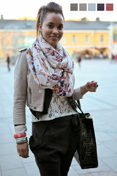 Note how skillfully she has chosen a slightly smallish jacket, and avoided a too small look by using another layer and accessories to elongate the sleeves. The scarf is quite voluminous, but looks good thanks to its light base color and loosely spaced print. Also, it is there to keep her warm as the jacket needs to be left unzipped in this look.