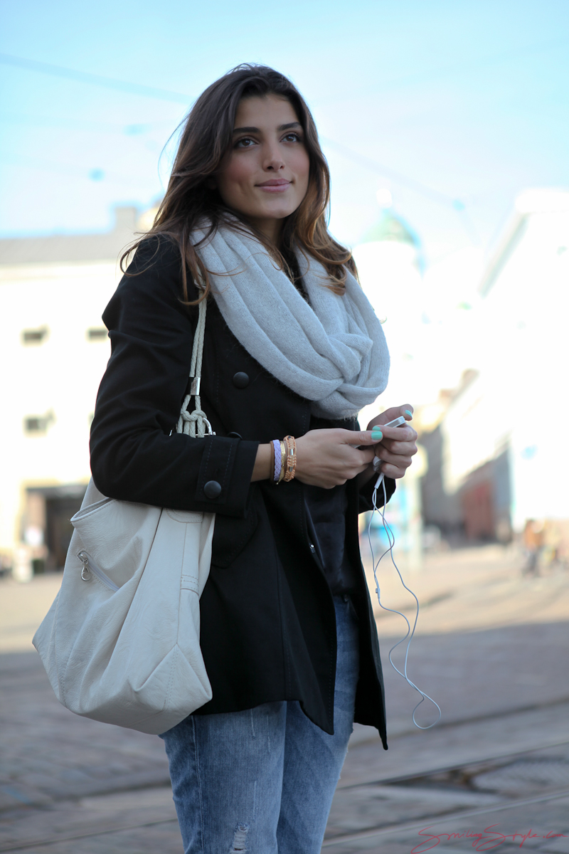 What an everyday supermodel!! And I don’t mean only her looks, but really her personality, and the way she accommodated my request to take her picture. I got so many great pics, and actually fell in love with the sailor jacket, and the scarf. This is also a good example of having a fairly conservative outfit without too much going on, but then completing the look with some small details such as the bracelets and the funky nail polish. I also wonder where I could find one of those “round” scarves… I tried with a normal one, but it didn’t work out that well. But maybe you can make it work better 🙂 For some good tips on how to wear all those scarves, search for “scarf tutorial” or “25 ways to wear a scarf” on youtube.